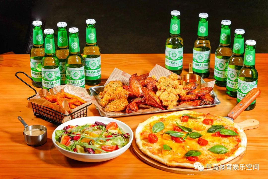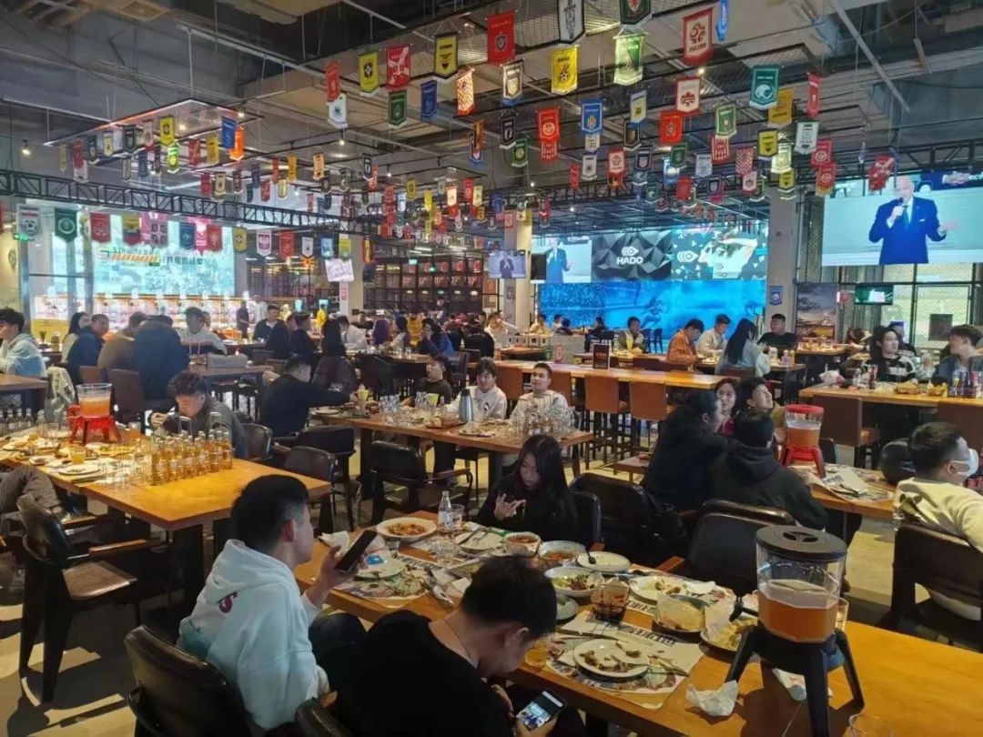 被餐饮区包围的是一个环形的吧台,大红色的台面和暖色灯光、吧台中间的金属管道、上方摆放的五颜六色的红酒、外围一排高脚椅,已经有美剧那味了~吧台提供各种美食美酒,炸鸡薯条汉堡可乐这些西式快餐颇受欢迎。多台巨型LED大屏几乎覆盖整个店,全天候播放体育赛事,是体育迷的福音。现在正值多体育赛事时期,而且11月即将举行世界杯,许多人聚在一起,桌上放着各种美食饮料,大家吃吃喝喝,肆意玩乐,举杯为比赛欢呼庆祝,太痛快了。